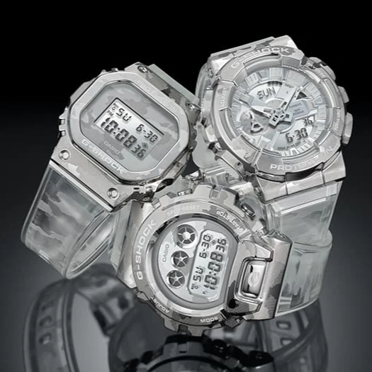 This new G-SHOCK Metal Covered Series features a fashionable semi-transparent band and camouflage pattern. The bezel is forged, cut, and polished and then given a camouflage pattern using a laser. The face and semitransparent band are also printed with a camouflage pattern.This combines with silver coloring to create designs that are both simple and stylish.