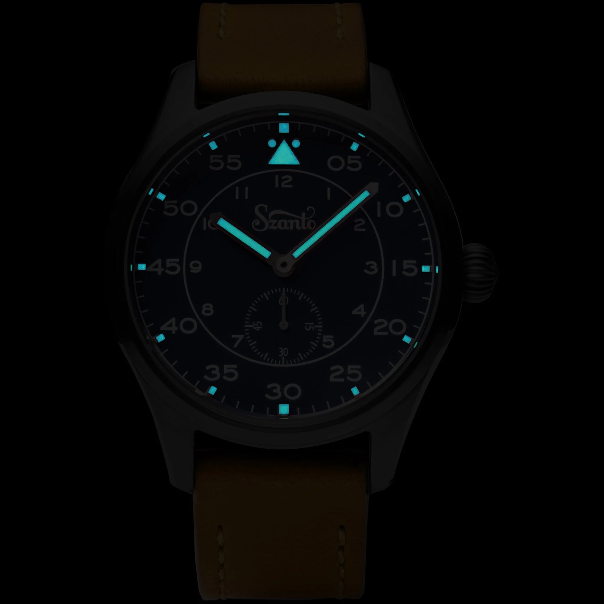 Szanto watches are a modern take on classic vintage watch designs - with classic styling and the highest quality workmanship. Szanto's modern components offer accuracy and affordability. Szanto Vintage inspired Heritage Aviator 2757 features a 41mm 316L stainless steel case with IP Gunmetal Gray plating, push in crown and screw down caseback, dependable and accurate Japan Quartz Small Seconds movement (Miyota 1L45), a flat hardened mineral crystal, high quality Swiss lume on the dial markings and hands for a superior and lasting glow. Calfskin leather strap with conventional signature buckle and Easy-Change Spring-bar system. Water resitant to 100 meters. Styles from the past, re-imagined for today --- take a step back in time with Szanto!