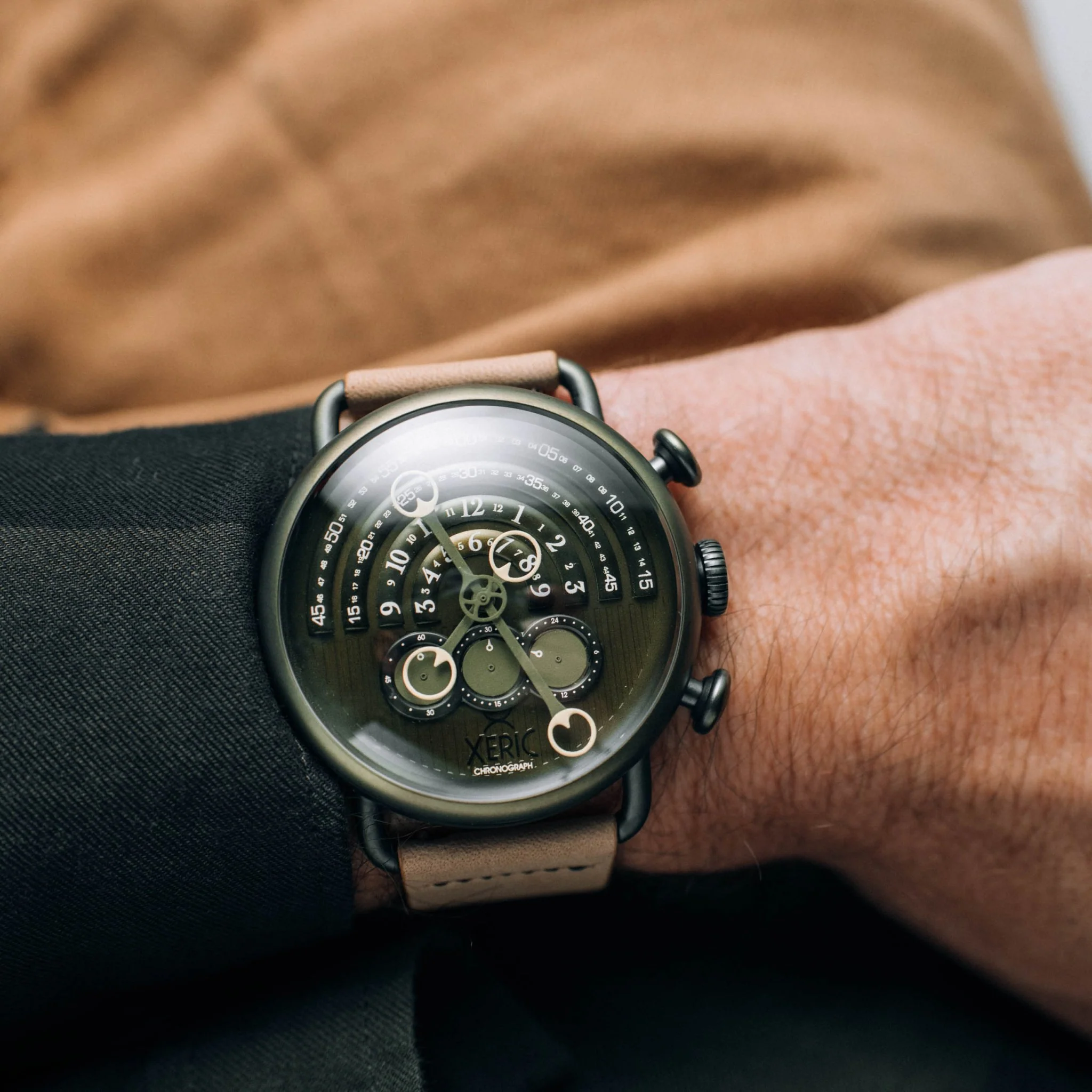 Love the Halograph Automatic but prefer chronographs? Introducing the Halograph Chrono Sapphire, powered by a Quartz Japanese Miyota movement. This features the same eye-popping design for this quartz iteration of the Xeric Halograph.