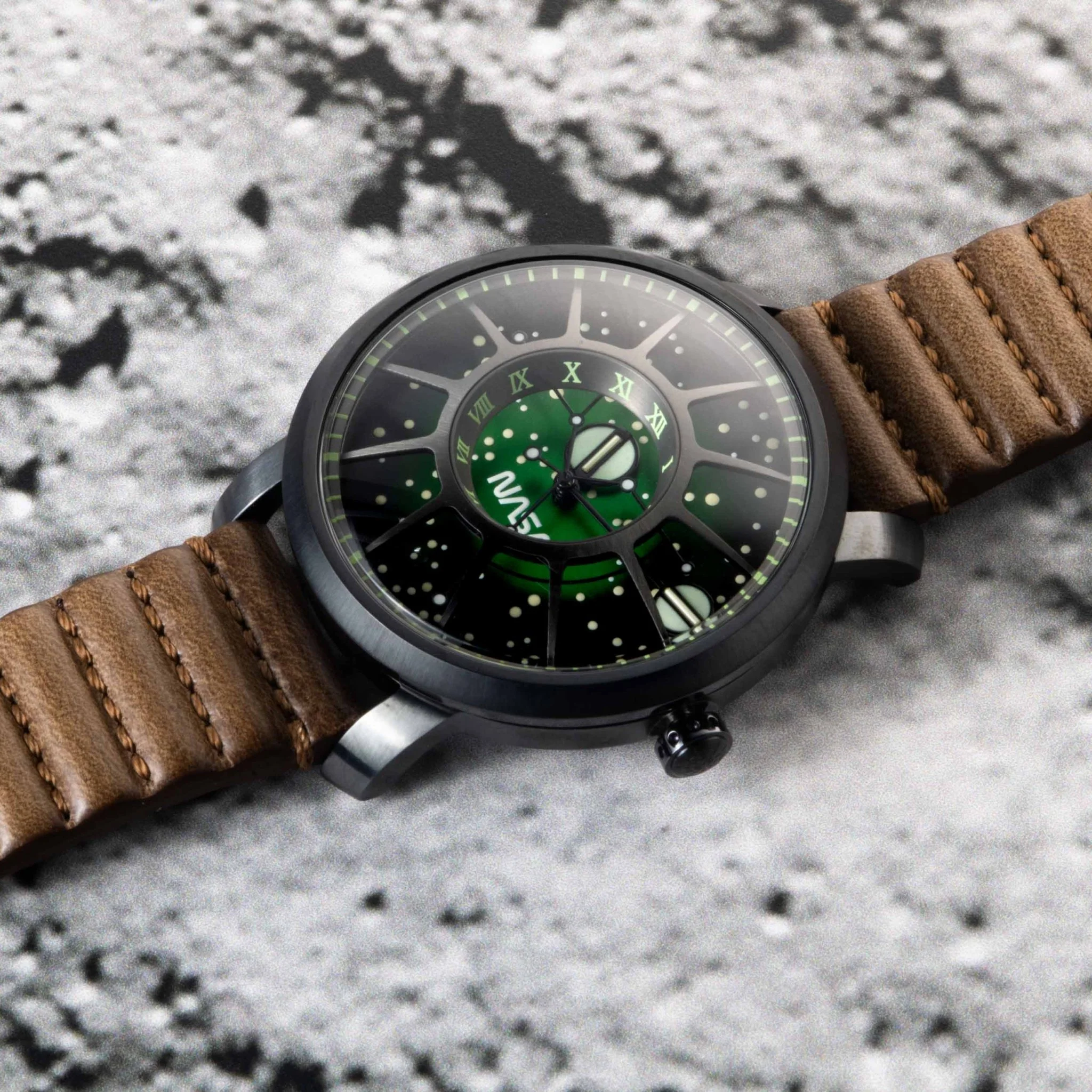 The grille of the Trappist-1 resembles the Cupola and gives you a sense of looking out into space. Each of the twelve support bridges also doubles as an hour marker. The domed crystal is made from Hesalite that was originally developed for NASA. The straps are made from U.S. Horween leather which is ribbed and stitched to pay tribute to the articulated ridge-lines seen on space gloves.
