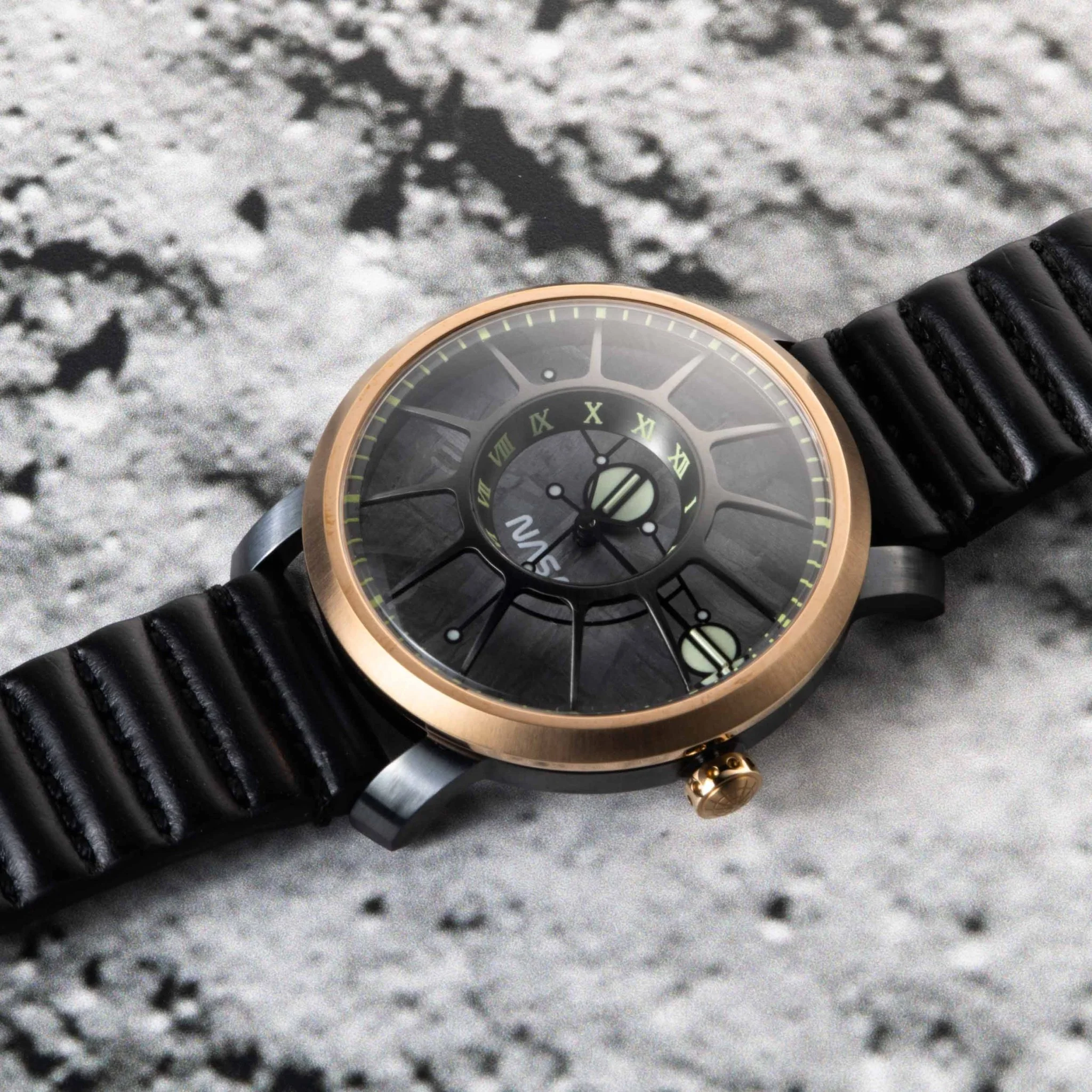 This Trappist-1 NASA Edition features a real meteorite dial and back-filled luminous hands. The Orbiting Planetary System consists of glowing Super-LumiNova indices and planets to help space explorers keep track of time as they travel in the darkest regions of the universe. The inner luminous planet represents the hours while the outer luminous planet shows the minutes, all while orbiting around the central axis. The Trappist-1 Automatic model also features tritium tubes! You'll always be able to read the time, even in the dark void of space. The constellation-like seconds hand sweeps across the dial similar to comets streaking across the night sky.