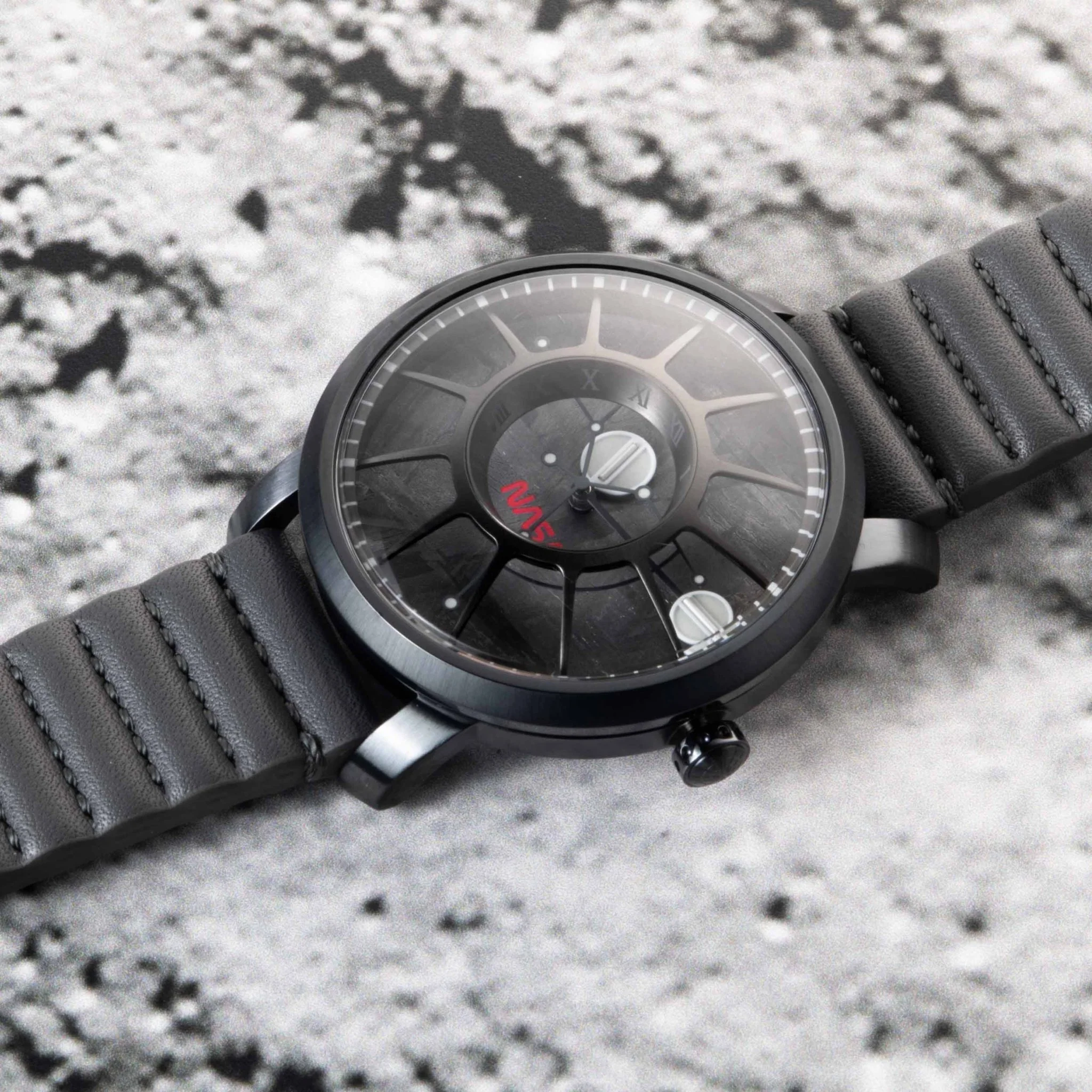 This Trappist-1 NASA Edition features a real meteorite dial and back-filled luminous hands. The Orbiting Planetary System consists of glowing Super-LumiNova indices and planets to help space explorers keep track of time as they travel in the darkest regions of the universe. The inner luminous planet represents the hours while the outer luminous planet shows the minutes, all while orbiting around the central axis. The Trappist-1 Automatic model also features tritium tubes! You'll always be able to read the time, even in the dark void of space. The constellation-like seconds hand sweeps across the dial similar to comets streaking across the night sky.