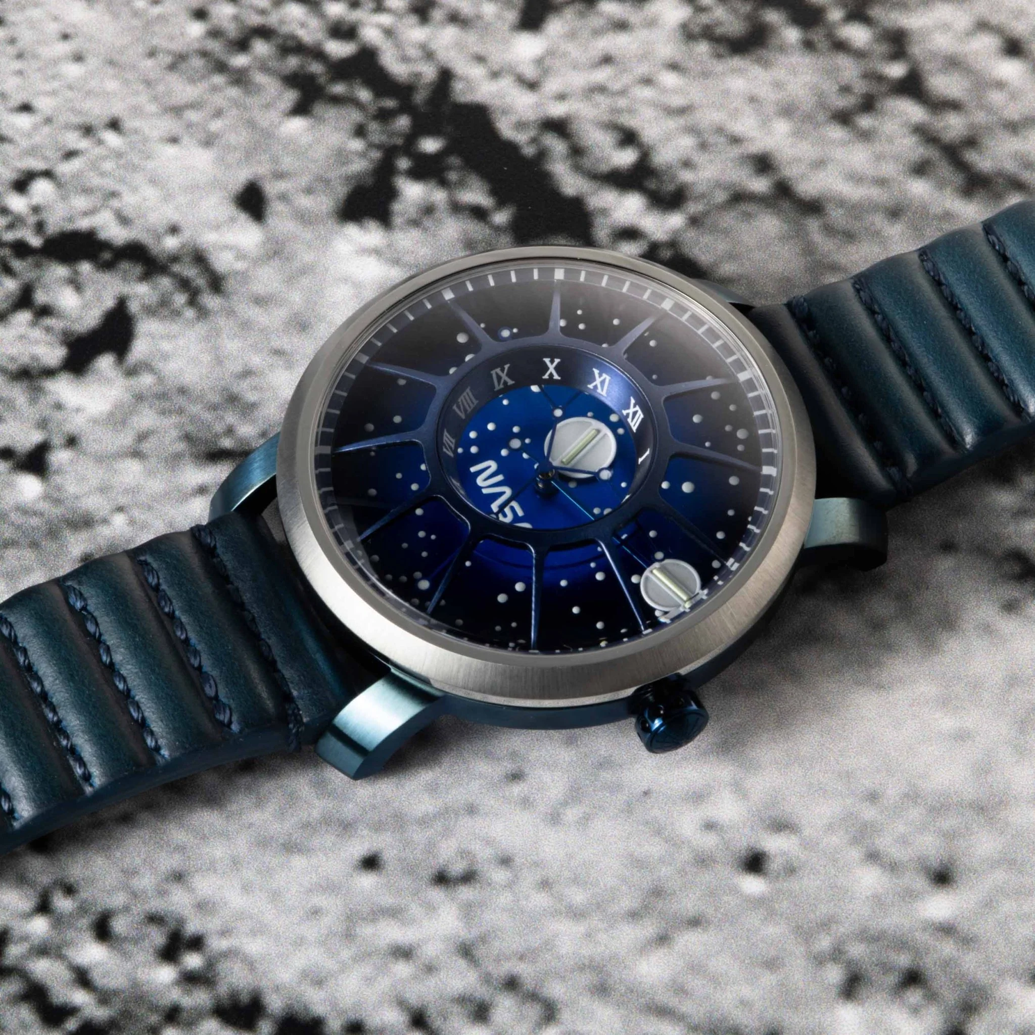 The grille of the Trappist-1 resembles the Cupola and gives you a sense of looking out into space. Each of the twelve support bridges also doubles as an hour marker. The straps are made from U.S. Horween leather which is ribbed and stitched to pay tribute to the articulated ridge-lines seen on space gloves.